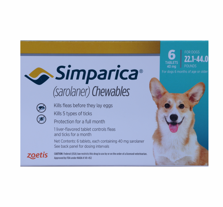SIMPARICA 6TABS - SIMPARICA 40 MG(10-20KG)22-44 is backordered and will ship as soon as it is back in stock.