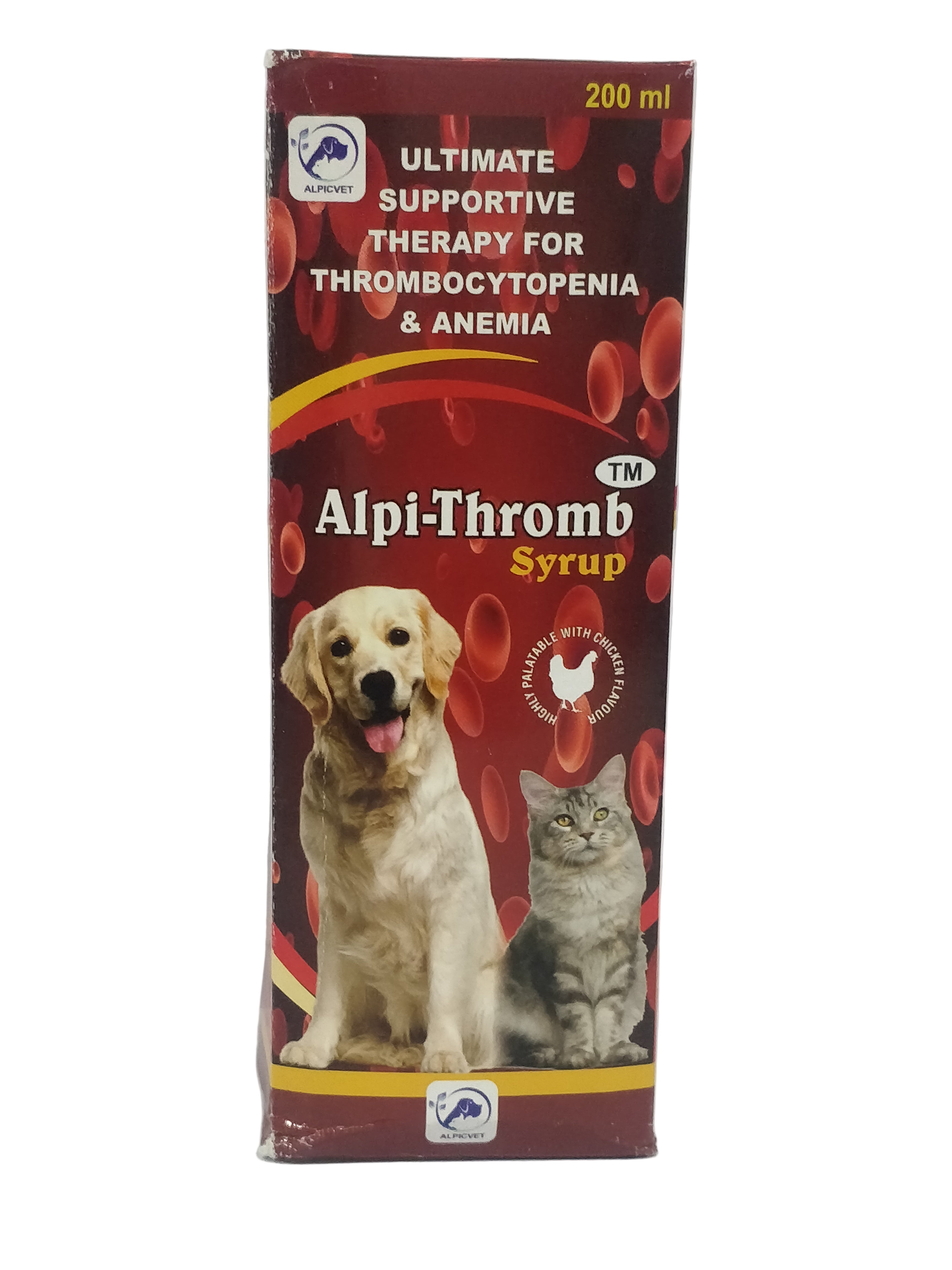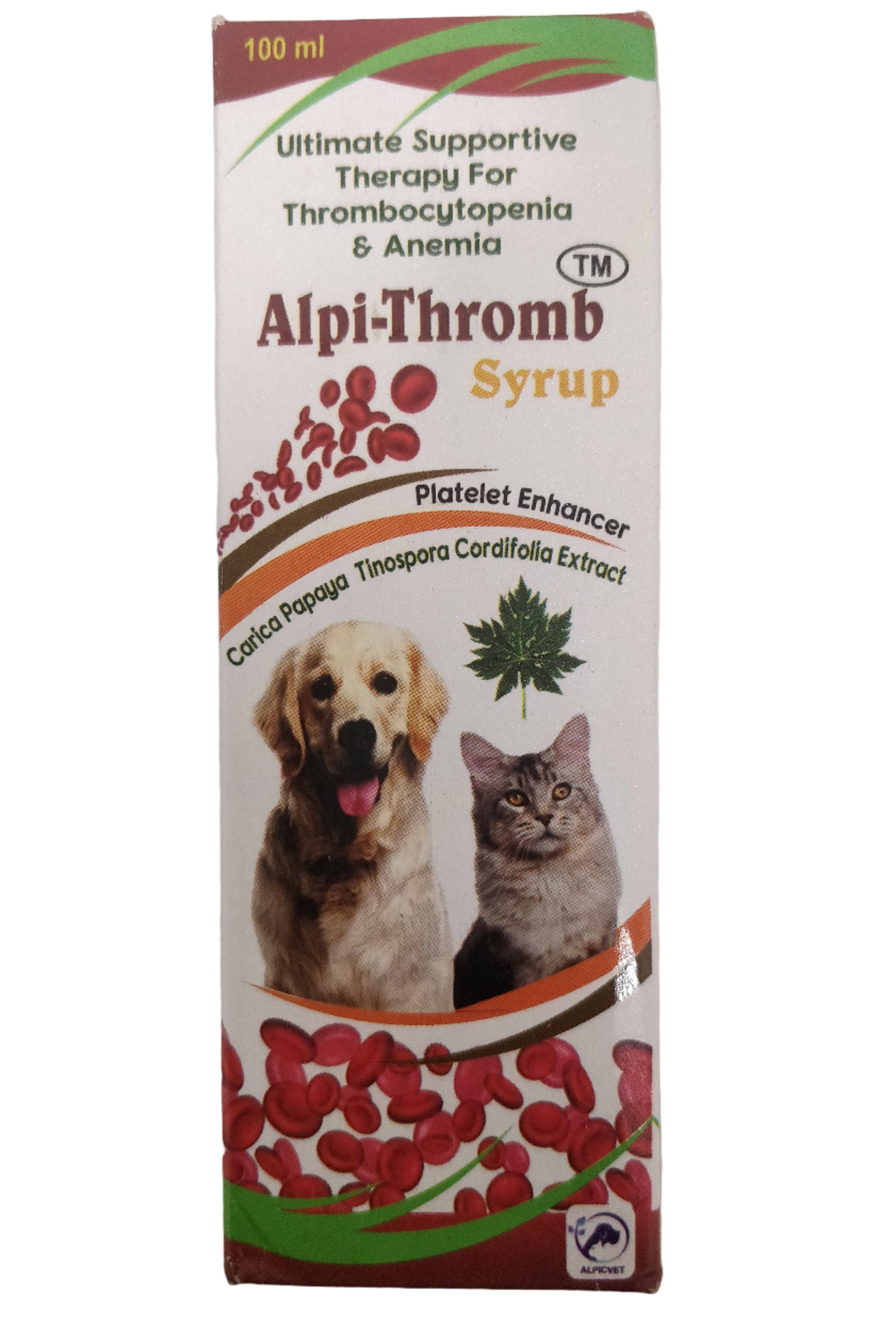 Alpi-Thromb Syrup by Alivira Animal Health Ltd. is a herbal supplement formulated with Carica papaya leaf extract to support platelet count, immunity, and overall well-being in animals.