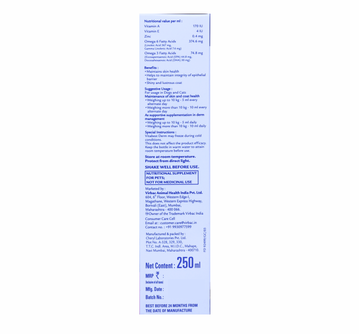 VITABEST DERM SYRUP FOR SKIN AND COAT HEALTH OF CATS & DOGS 250ML